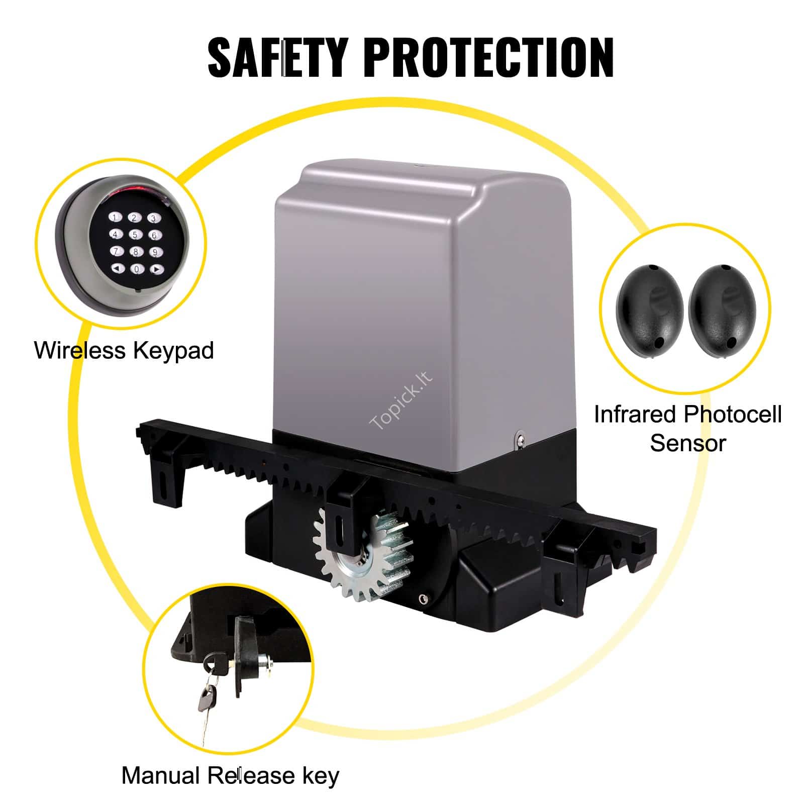- Infraraudonųjų spindulių jutiklis automatiškai sustabdo arba atidaro vartus, kai jie susiduria su kliūtimi.