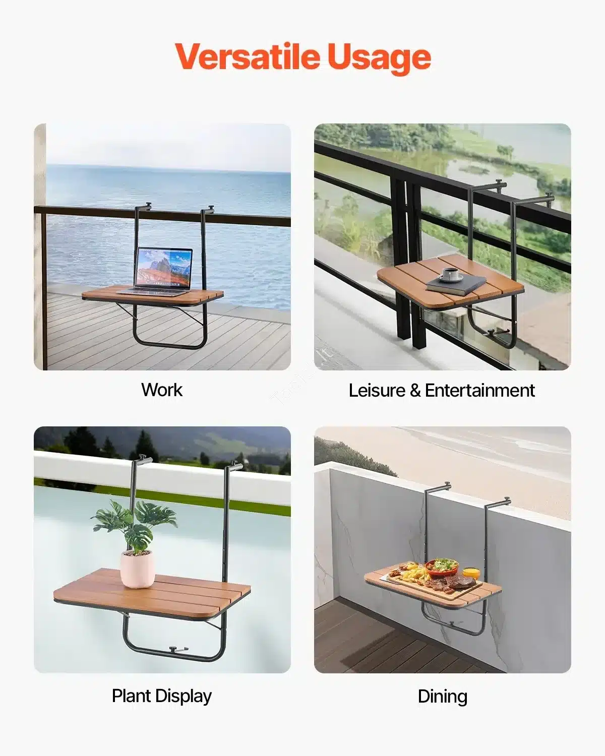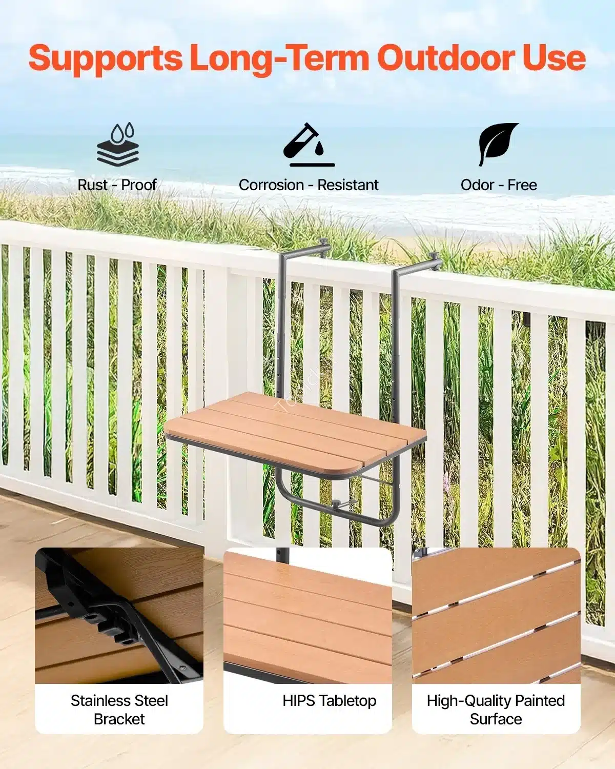 • Patikimas balkono turėklų tvirtinimas leidžia stabiliai pritvirtinti stalą ant įvairių pločių turėklų 🛠️.