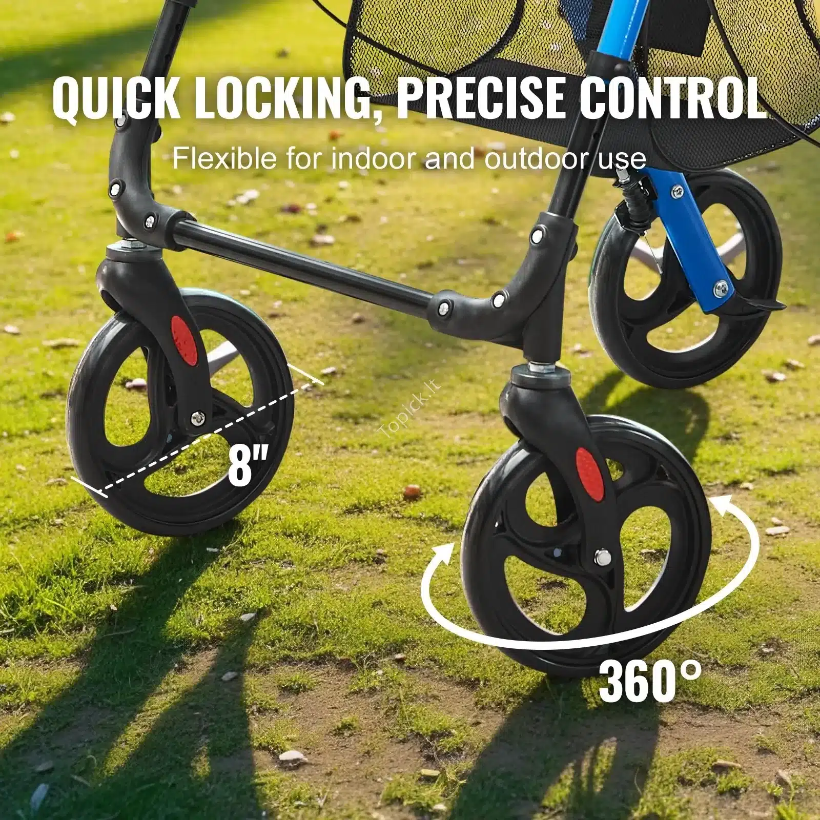 Dėl 20 cm visureigių ratų rolatorius puikiai tinka tiek vidaus, tiek lauko sąlygoms, užtikrindamas stabilumą ant įvairių paviršių, tokių kaip asfaltas, žolė ar akmens keliai. Rolatorius turi reguliuojamą sėdynės ir rankenos aukštį, todėl jį lengvai pritaikysite prie savo ūgio, užtikrindami taisyklingą laikyseną ir maksimalų komfortą.