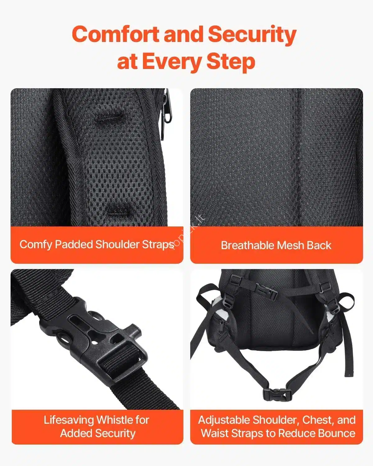 - Komfortas ir Saugumas: Kuprinė turi kvėpuojančią tinklinę nugaros plokštę ir paminkštintus pečių dirželius, kad neperkaistumėte. Integruotas avarinis švilpukas ir vamzdelio fiksatorius užtikrina patogumą ir saugumą.