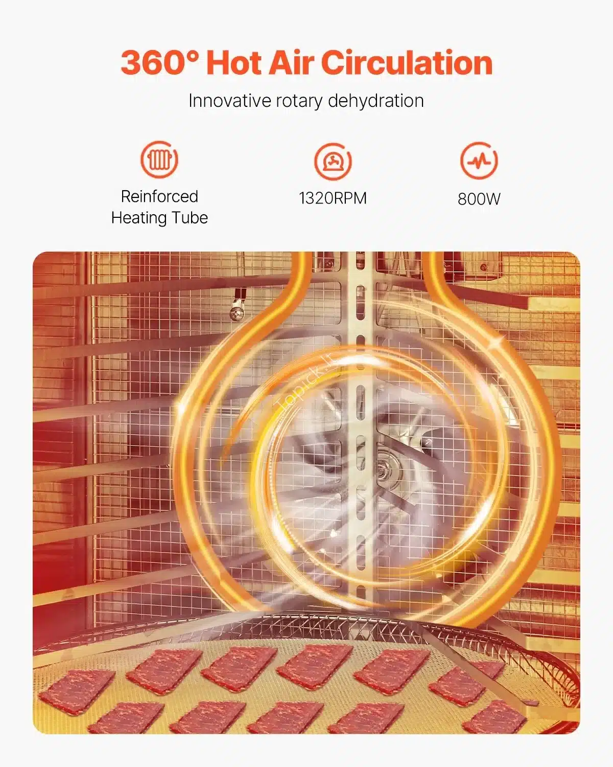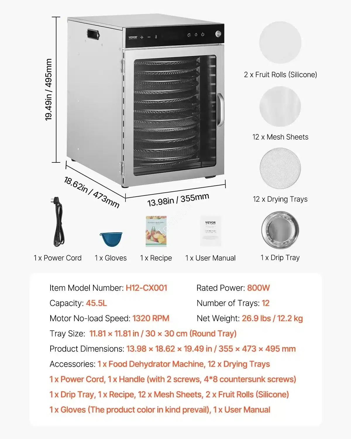Ieškote galingo dehidratoriaus dideliems kiekiams maisto džiovinti? Ši nerūdijančio plieno džiovyklė su 12 padėklų ir 800 W galia – puikus pasirinkimas! Ji efektyviai ir tolygiai išdžiovins vaisius, daržoves, mėsą ar grybus, išsaugodama visas maistingąsias medžiagas. Puikiai tinka ir namams, ir nedideliam verslui. 🍄