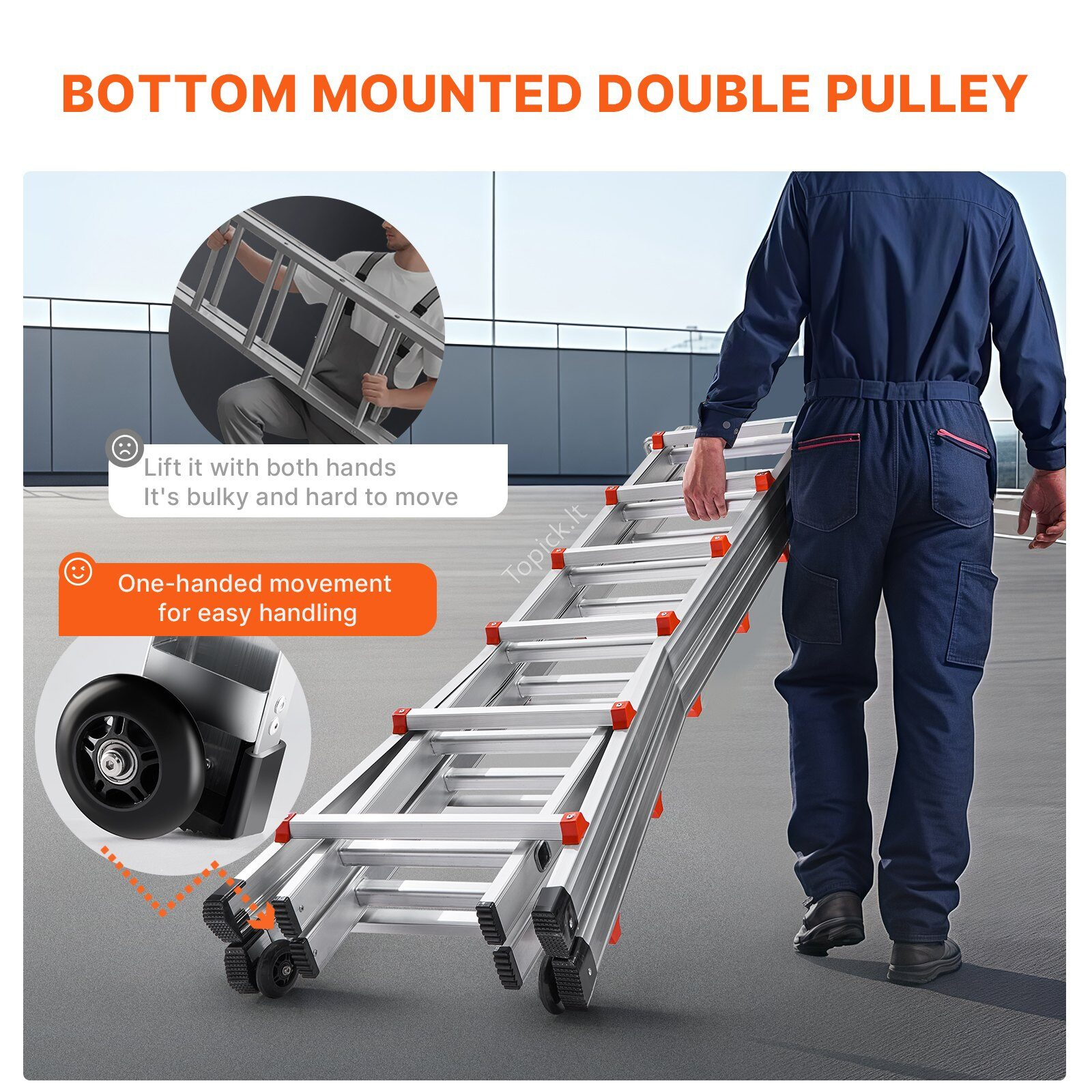 - Lengva perkelti: Pagrindas turi dvigubus ratus, todėl jį lengva transportuoti viena ranka. Nebereikia kelti tradicinių kopėčių ir jūsų patirtis tampa malonesnė.