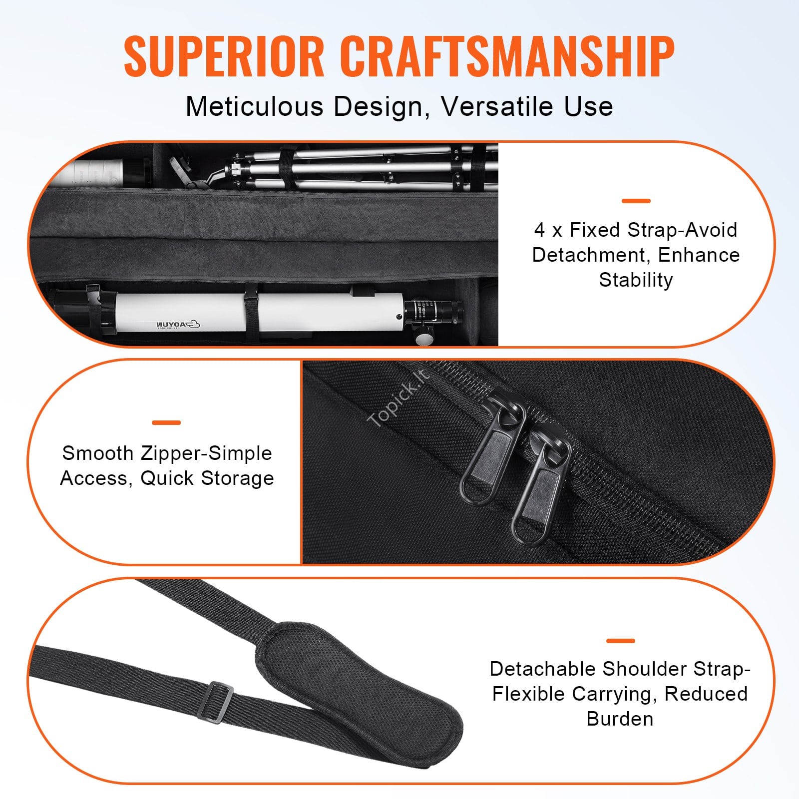 - Keturių sluoksnių saugumas: teleskopo krepšys pagamintas iš 4 aukštos kokybės medžiagų, įskaitant tvirtą ir dilimui atsparų 900D Oxford audinį, vandeniui ir drėgmei atsparią PU dangą, smūgius sugeriantį perlinės medvilnės pamušalą ir minkštą aksominį vidinį pamušalą, užtikrinantį puikią teleskopo apsaugą visais atžvilgiais.
