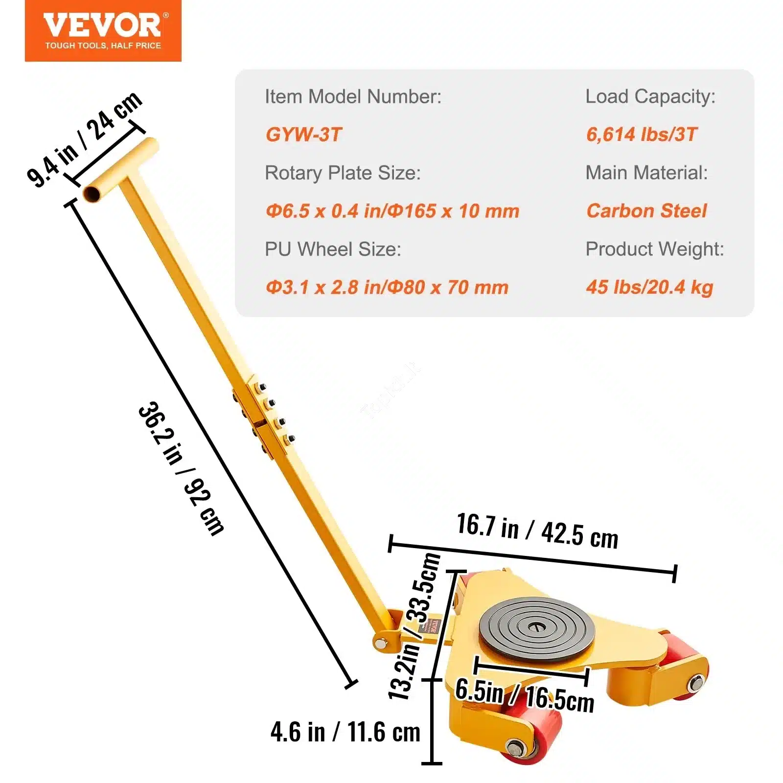 Šis pramoninis transportavimo vežimėlis (3 t) su patogia rankena sukurtas sunkių įrenginių, baldų ar mašinų perkėlimui. Jo konstrukcija užtikrina ilgaamžiškumą, stabilumą ir sklandų naudojimą tiek sandėliuose, tiek dirbtuvėse.