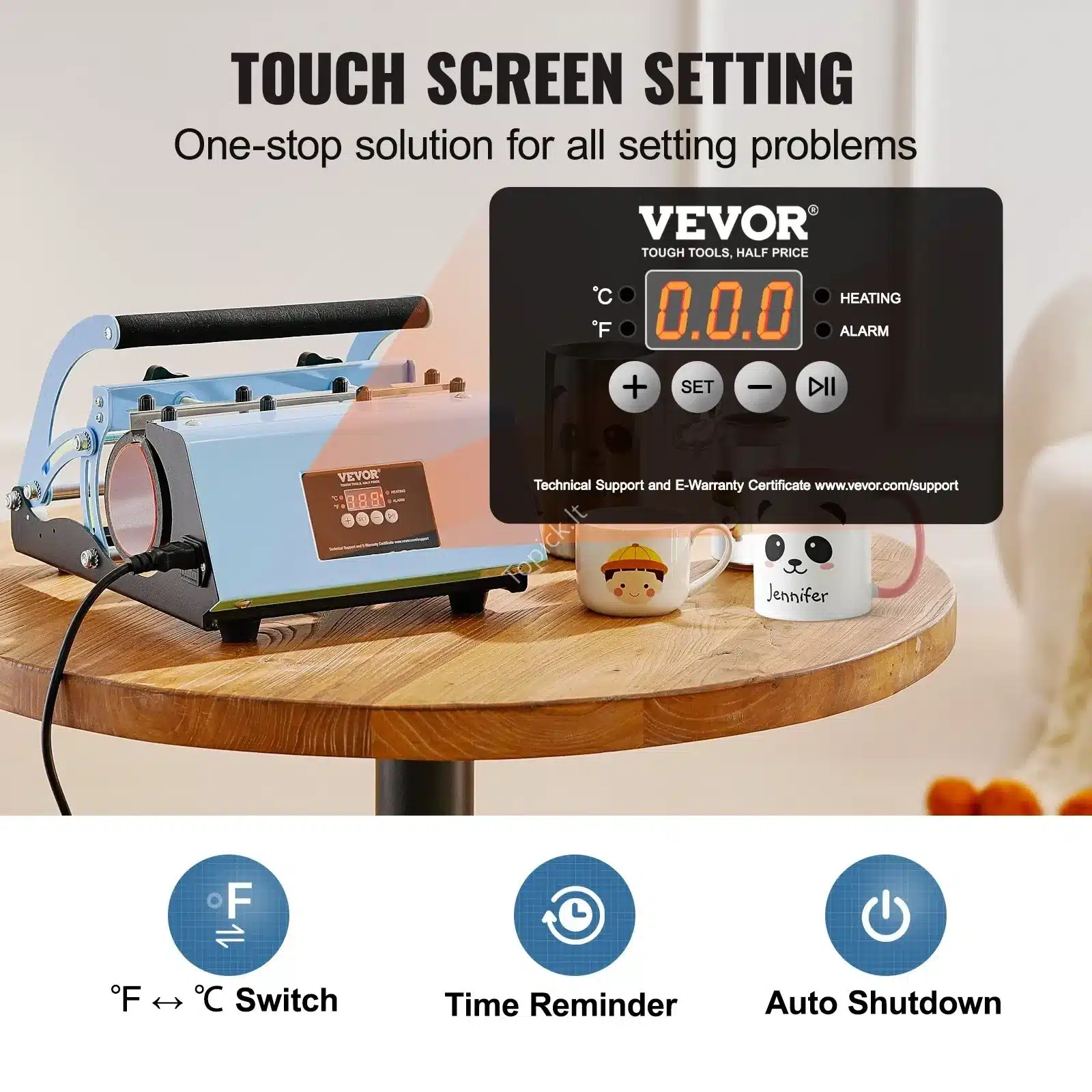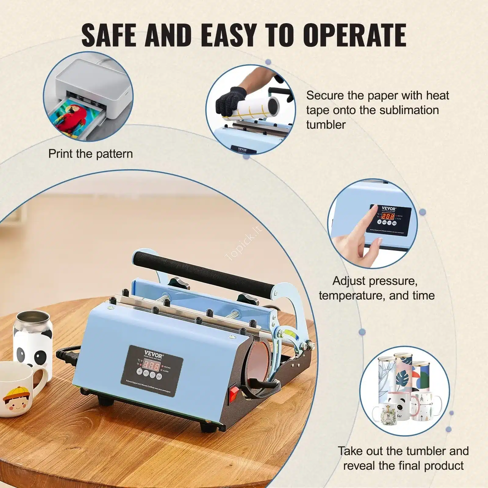 Norite sukurti unikalų dizainą ant didelių puodelių ar termosų? Šis specializuotas sublimacinis presas yra puikus įrankis! Jis skirtas ypač dideliems puodeliams, kurių talpa siekia iki 887 ml (30 oz). Dėl kompaktiško ir patikimo dizaino, šis termo presas puodeliams puikiai tinka tiek pradedantiesiems, tiek patyrusiems naudotojams, norintiems užsiimti individualia spaudos gamyba namuose ar smulkiame versle. 🎨