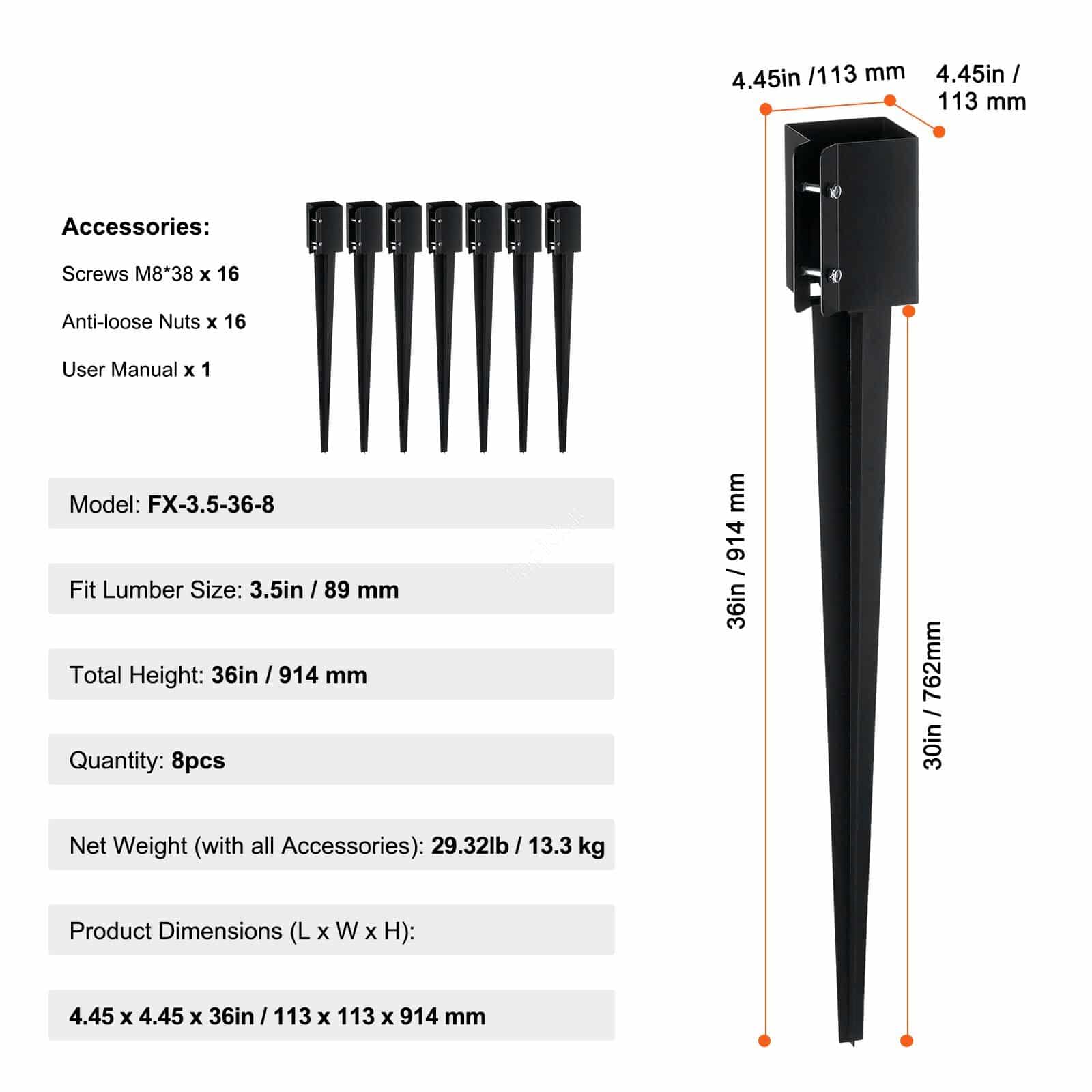 🛠️ 8 vnt. žemės smaigai – 113 x 113 x 914 mm, tvirti metaliniai kuolai tvoros stulpams, juodi