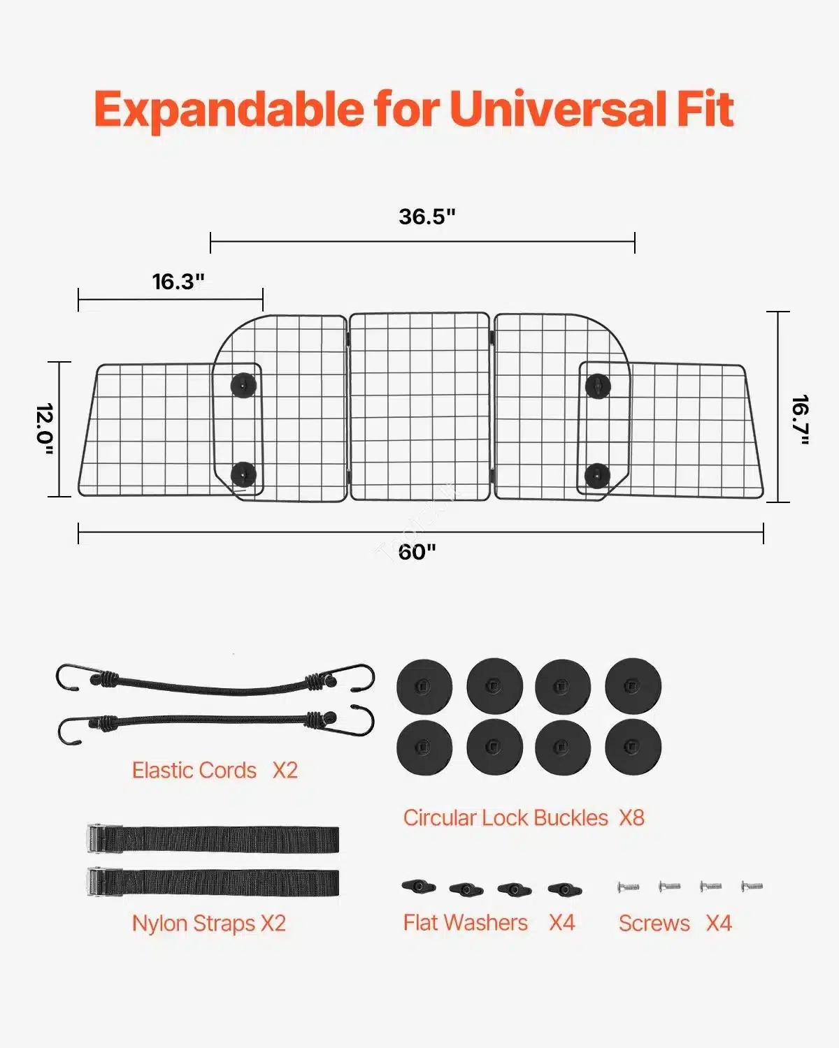 - Universalus dizainas: tinka daugumai automobilių, visureigių ir furgonų. Pertvaros matmenys yra 928 x 423 mm (ilgis x plotis).
