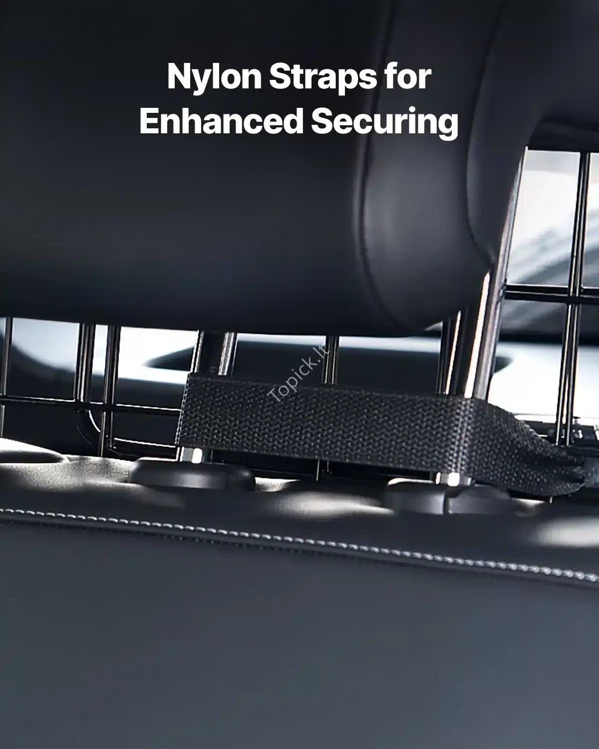 - Paprastas montavimas: pritvirtinimas prie galvos atramų nereikalauja specialių įrankių ar gręžimo, o neslystančios kojelės ir įtempiamoji atrama garantuoja stabilumą.