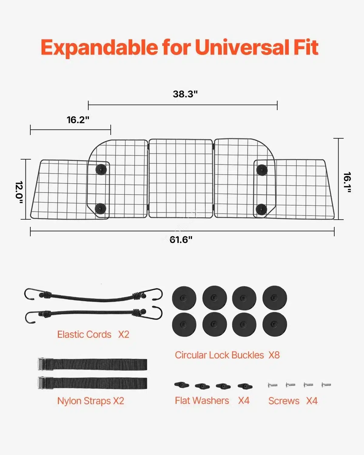 Užtikrinkite maksimalų saugumą kelyje su savo augintiniu naudodami šią tvirtą, universalią automobilio pertvarą. 🛡️ Šios apsauginės grotelės skirtos atskirti gyvūną nuo priekinių sėdynių ar bagažinės, kad galėtumėte susikoncentruoti į vairavimą, o jūsų augintinis jaustųsi saugiai. Dėl savo reguliuojamo pločio ir aukščio, grotelės puikiai tinka daugeliui transporto priemonių, įskaitant visureigius, mikroautobusus ir furgonus.