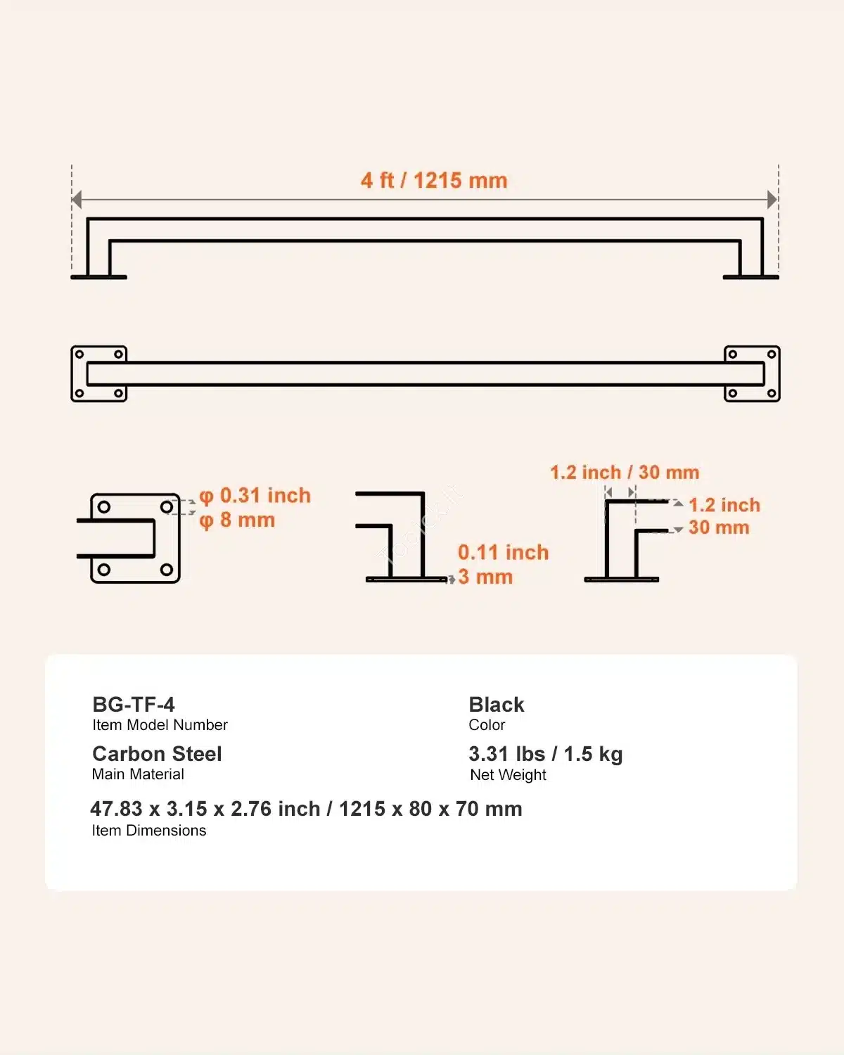 • Tvirtumas ir ilgaamžiškumas: Pagamintas iš aukštos kokybės anglinio plieno, atlaiko dideles apkrovas iki 113,4 kg. Atsparus korozijai ir oro sąlygoms.