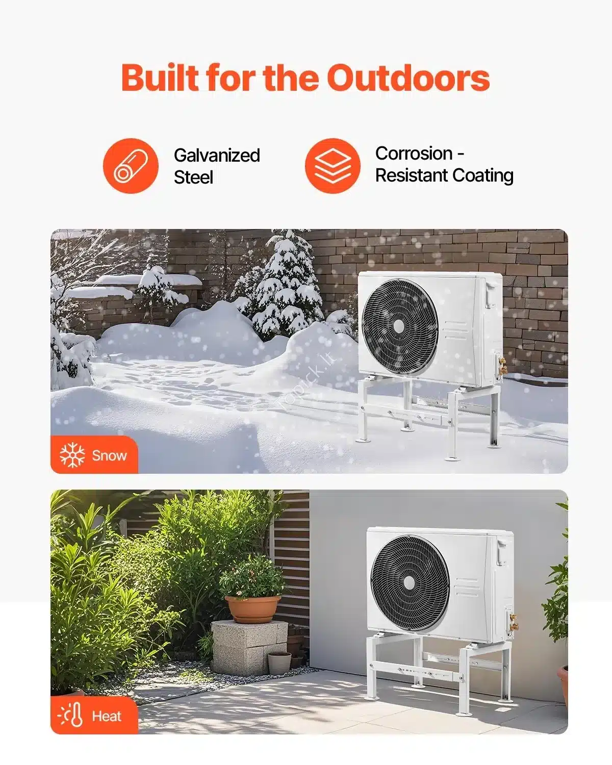 - Pakėlimas nuo Žemės: Stovas pakelia oro kondicionieriaus lauko bloką nuo žemės, apsaugodamas jį nuo vandens, sniego, purvo ir piktžolių, kas yra gyvybiškai svarbu įrangos ilgaamžiškumui.