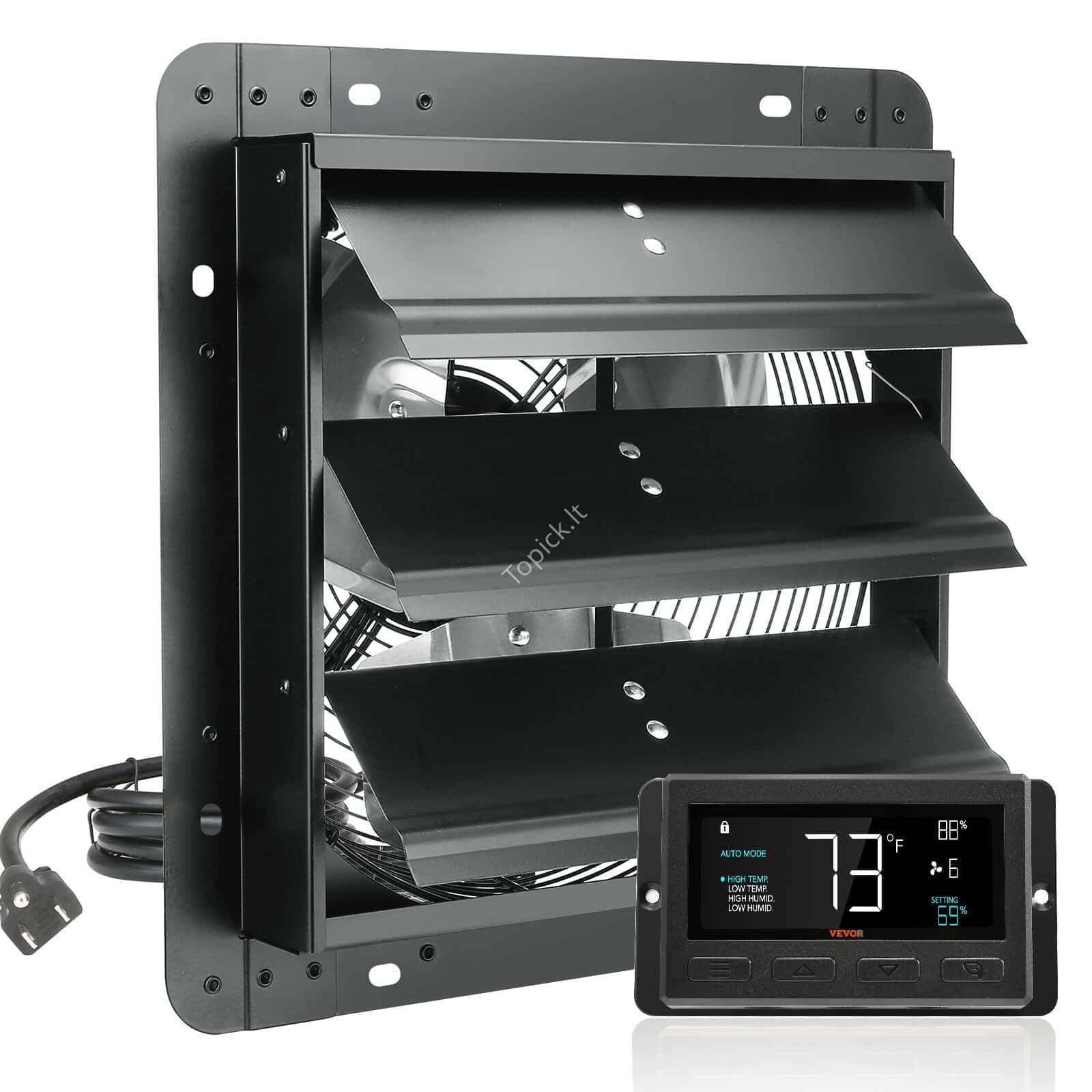 Ventiliatorius turi nuotolinio valdymo pultą, leidžiantį patogiai reguliuoti veikimą. Tvirtas metalinis korpusas ir apsauginės grotelės užtikrina ilgaamžiškumą ir patikimumą. Automatinė uždarymo funkcija padeda išlaikyti šilumą patalpoje nenaudojant ventiliatoriaus. Puikiai tinka naudoti sandėliuose, dirbtuvėse, virtuvėse ar kitose patalpose, kuriose reikalingas efektyvus oro ištraukimas.