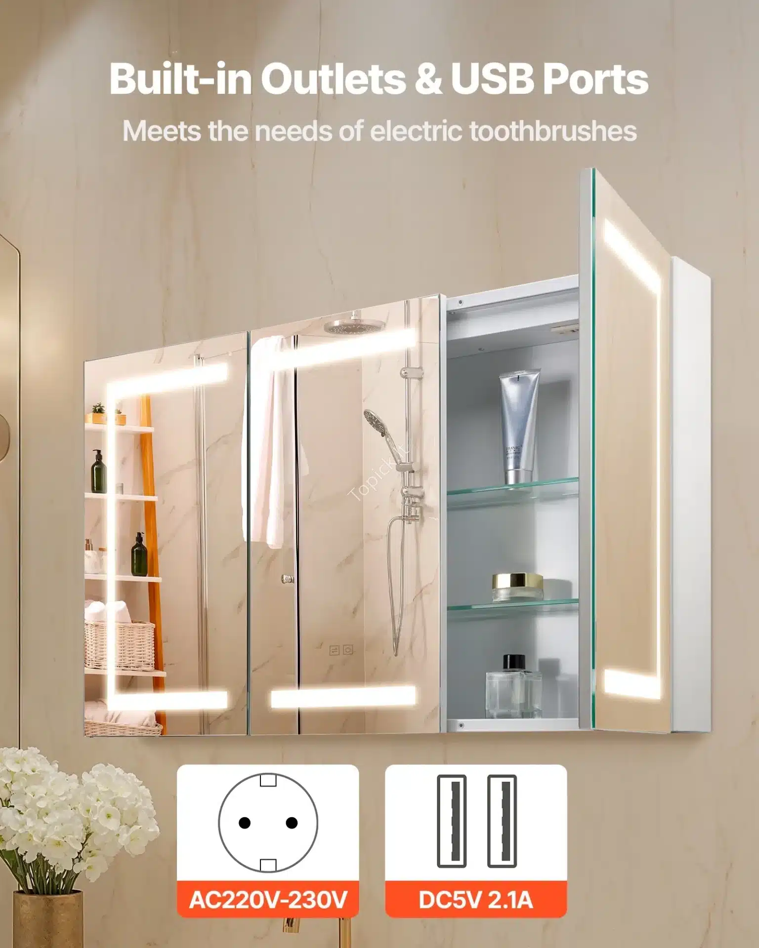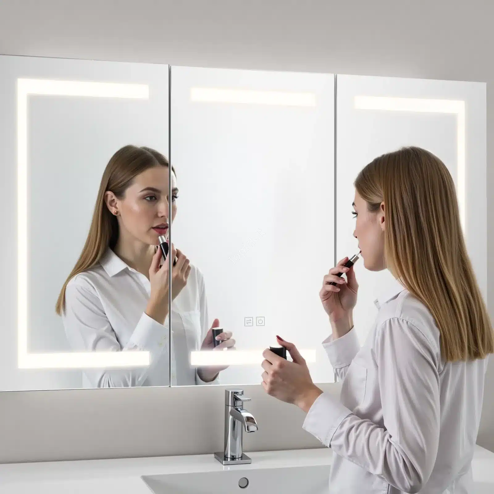 - Savybės: Reguliuojamas ryškumas ir 3 šviesos spalvų temperatūros (šaltai balta, natūrali, šiltai balta). Integruotas elektros lizdas skustuvams ar kitiems prietaisams.