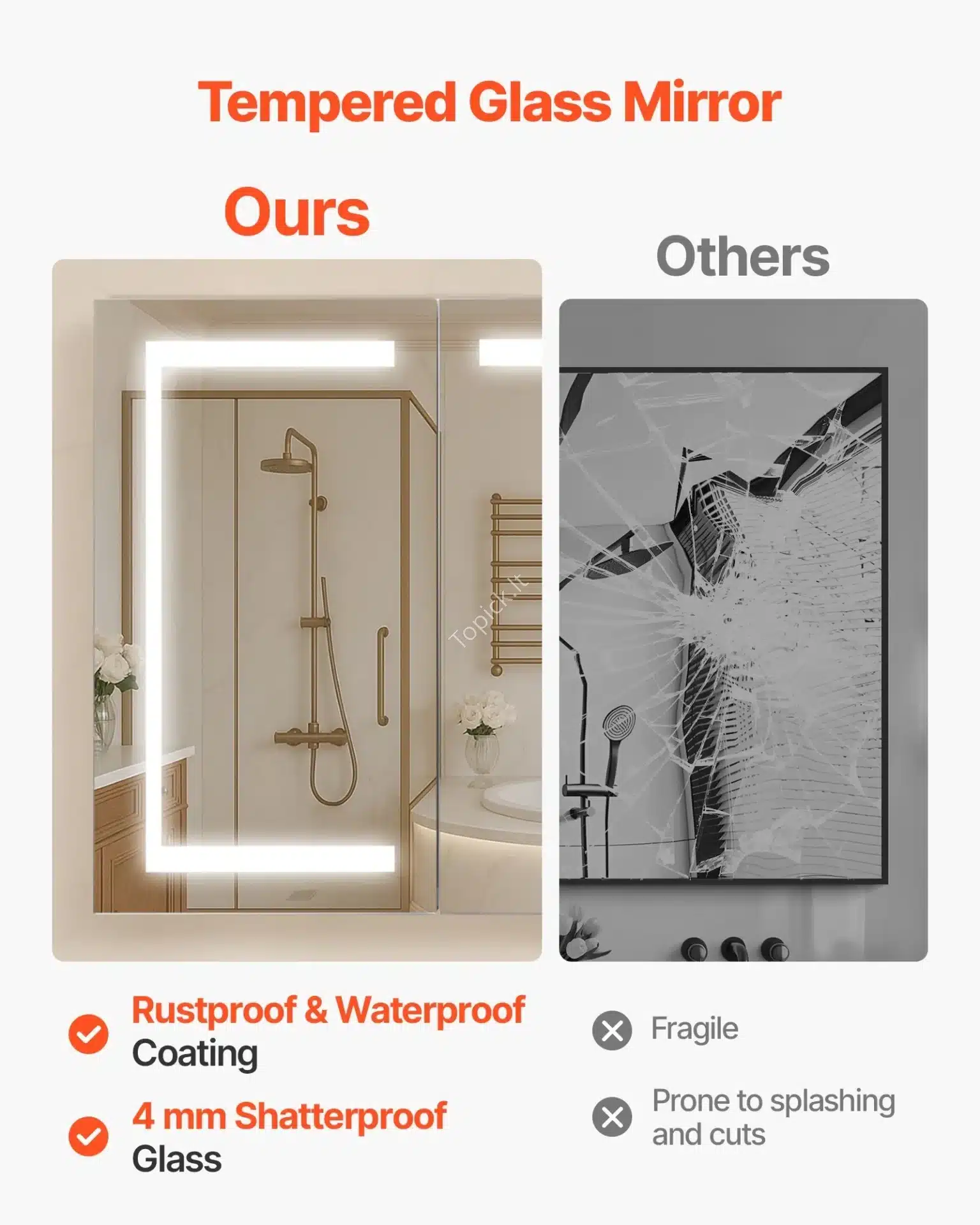 - Atsparumas: Veidrodis atsparus dūžiams ir sprogimui, turi epoksidinę dangą, kuri apsaugo nuo korozijos ir vandens.