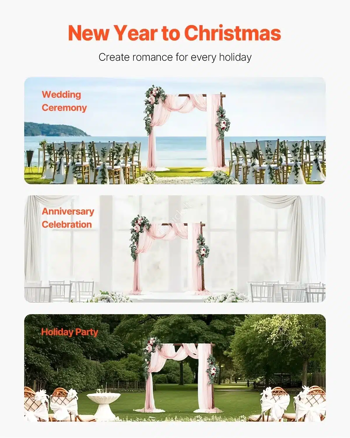 Sukurkite elegantišką ir šventišką atmosferą savo ypatingai dienai su šiuo dirbtiniu vestuvių arkos komplektu, kuris apima viską, ko reikia, kad jūsų ceremonija būtų nepamirštama. Puikiai tinka vestuvėms, sužadėtuvėms, metinėms ar gimtadieniams.