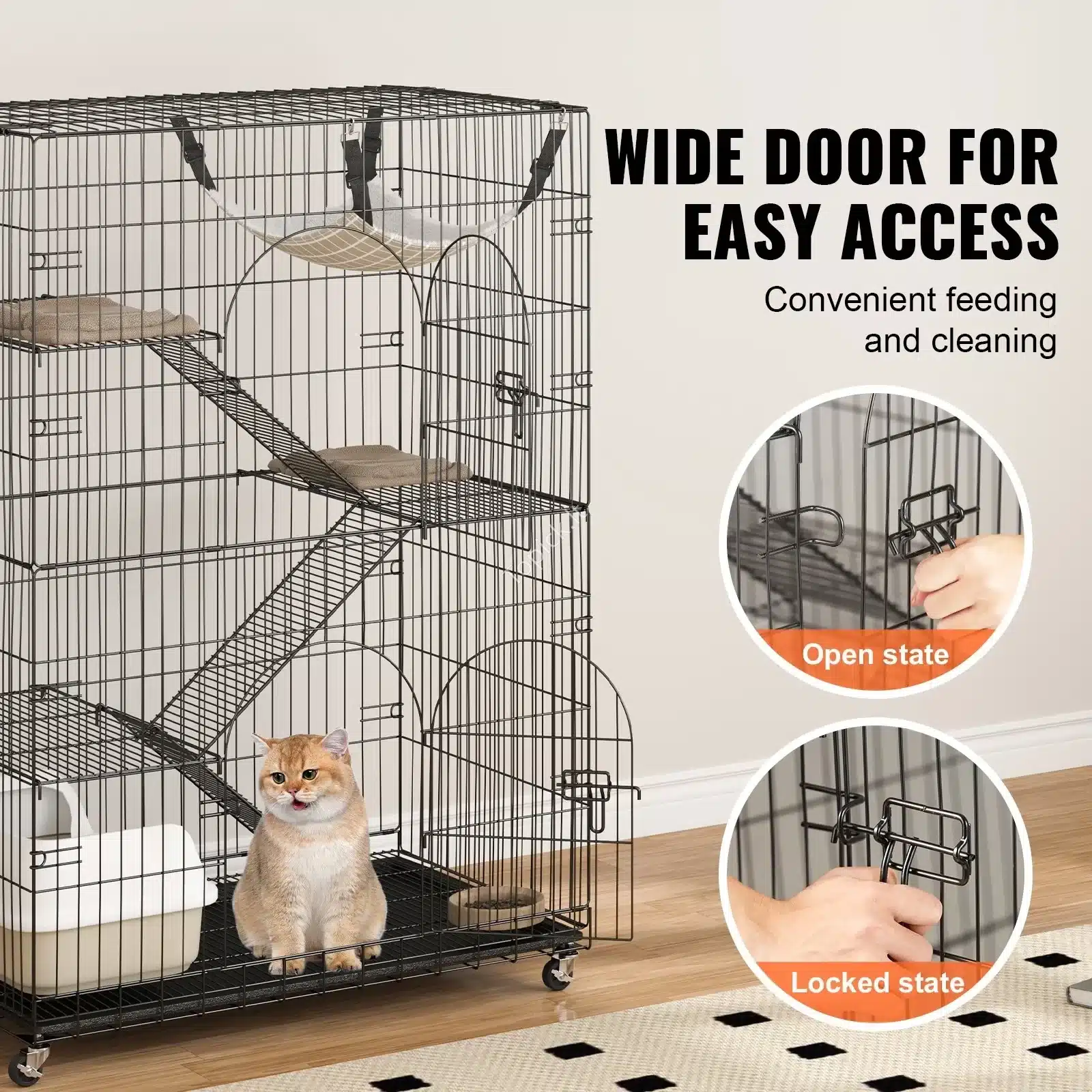 Didelės priekinės durys su užraktais leidžia lengvai pasiekti augintinį ir išvalyti narvą.