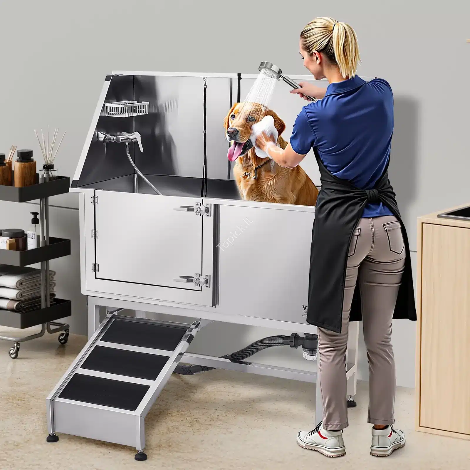 Ši profesionali nerūdijančio plieno vonia skirta patogiam ir efektyviam augintinių maudymui namuose ar specializuotame salone. 🛡️ Tvirta konstrukcija ir apgalvotas dizainas leidžia lengvai išmaudyti įvairaus dydžio šunis. Išimama rampa su neslystančiu paviršiumi palengvina didelių ar senyvų augintinių įlipimą ir išlipimą, o kairėje pusėje esančios atidaromos durys užtikrina patogų priėjimą.