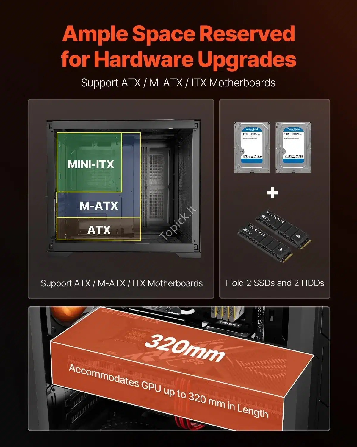 • Suderinamumas: Tinka ATX, M-ATX ir Mini-ITX pagrindinėms plokštėms.