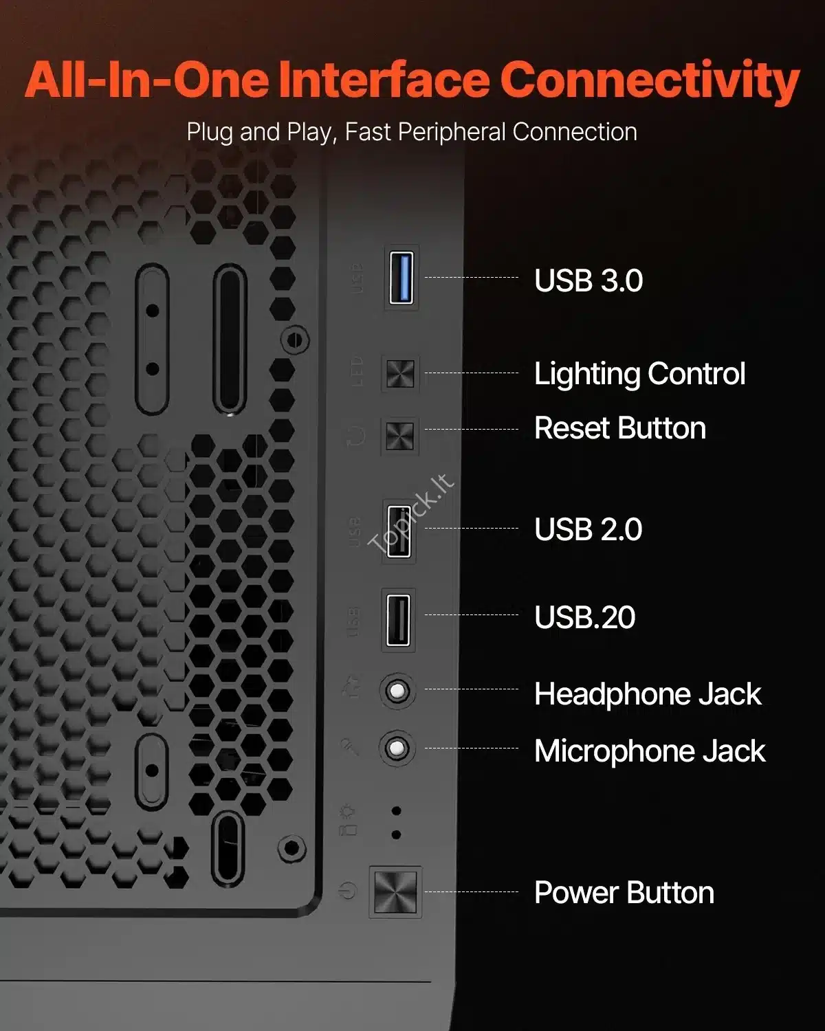 • Prijungimai: Priekinėje panelėje yra 1 x USB 3.0, 2 x USB 2.0, mikrofonas ir garso jungtys.