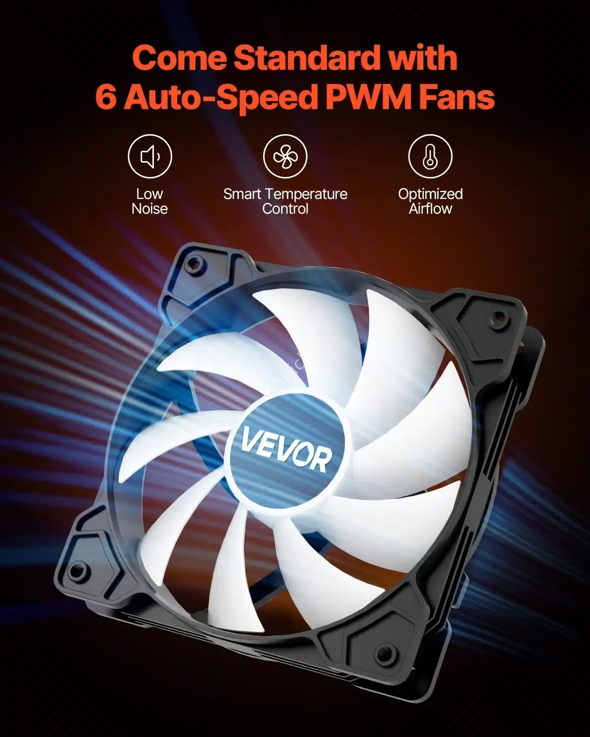 - Ventiliatoriai: Komplekte yra 6 x 120 mm ARGB PWM ventiliatoriai, užtikrinantys puikų aušinimą ir estetinį apšvietimą. Korpusas palaiko iki devynių 120 mm ventiliatorių.